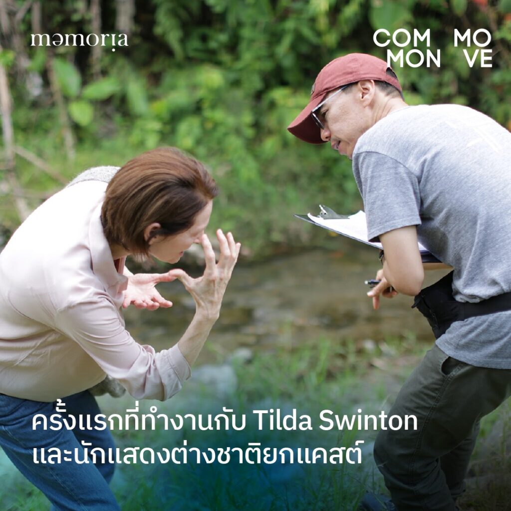 อภิชาติพงศ์เล่าว่าเขารู้จักกับทิลดา สวินตันมาเป็นเวลากว่าสิบปีแล้ว เริ่มจากทิลดาเขียนถึงผลงานของเขาในวารสารภาพยนตร์ แล้วจากนั้นได้มีโอกาสพูดคุยกันครั้งแรกที่เทศกาลภาพยนตร์ลอนดอน ความสัมพันธ์ฉันกัลยาณมิตรดำเนินเรื่อยมา เดิมทีเขาอยากร่วมงานกับทิลดาในผลงาน ‘รักที่ขอนแก่น’ (Cemetery of Splendor) แต่รู้สึกว่ายังไม่เหมาะเพราะผลงานนั้นเป็นเรื่องบ้านเกิดของเขา เขาอยากทำงานกับทิลดาในประเทศที่ 3 สถานที่ที่ทั้งเขาและเธอรู้สึกไม่คุ้นเคย MEMORIA จึงเป็นโอกาสที่ทั้งคู่รอคอย อภิชาติพงศ์ยังบอกอีกด้วยว่าการทำงานกับทิลดานั้นไม่เหมือนการทำงานกับนักแสดงชื่อดังระดับโลกแต่เหมือนการทำงานกับคนในครอบครัวมากกว่า
